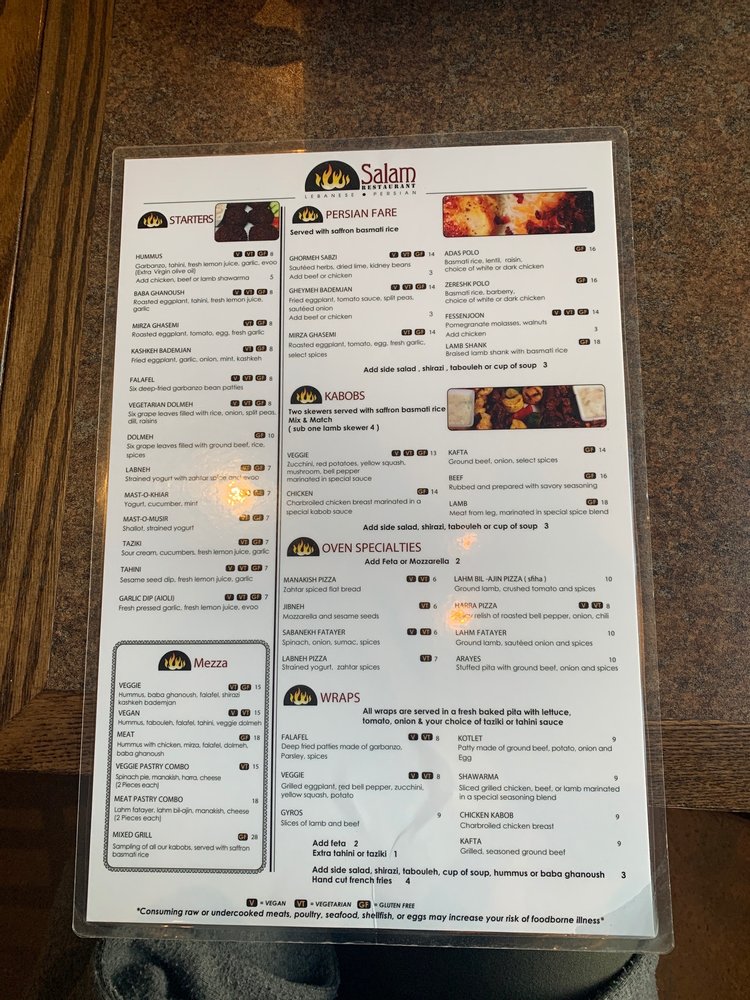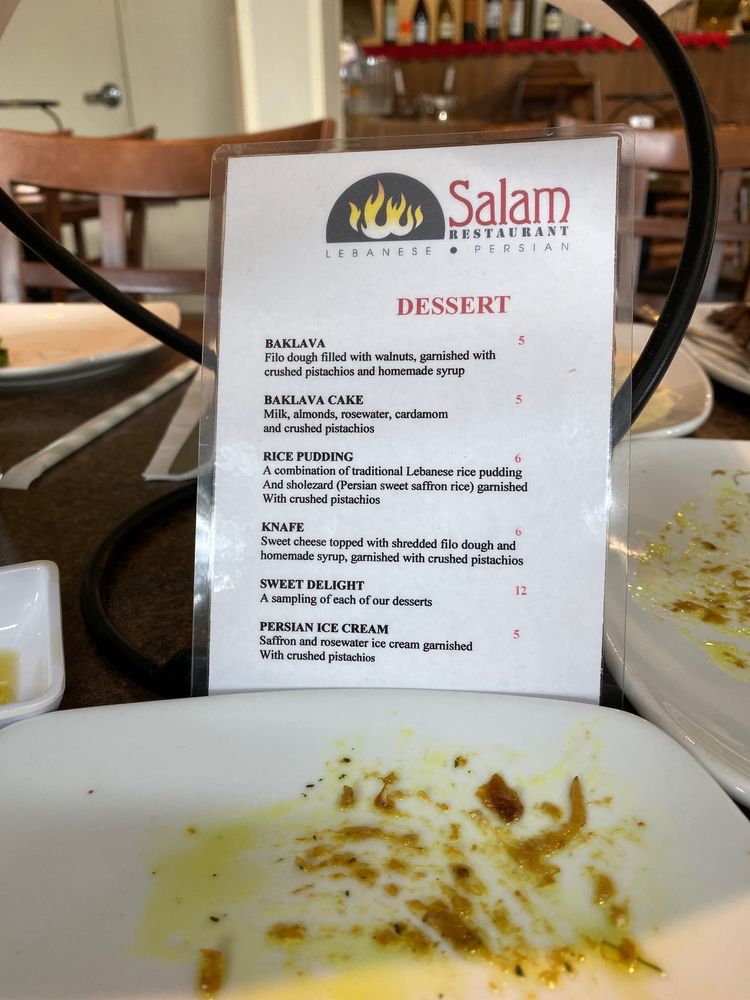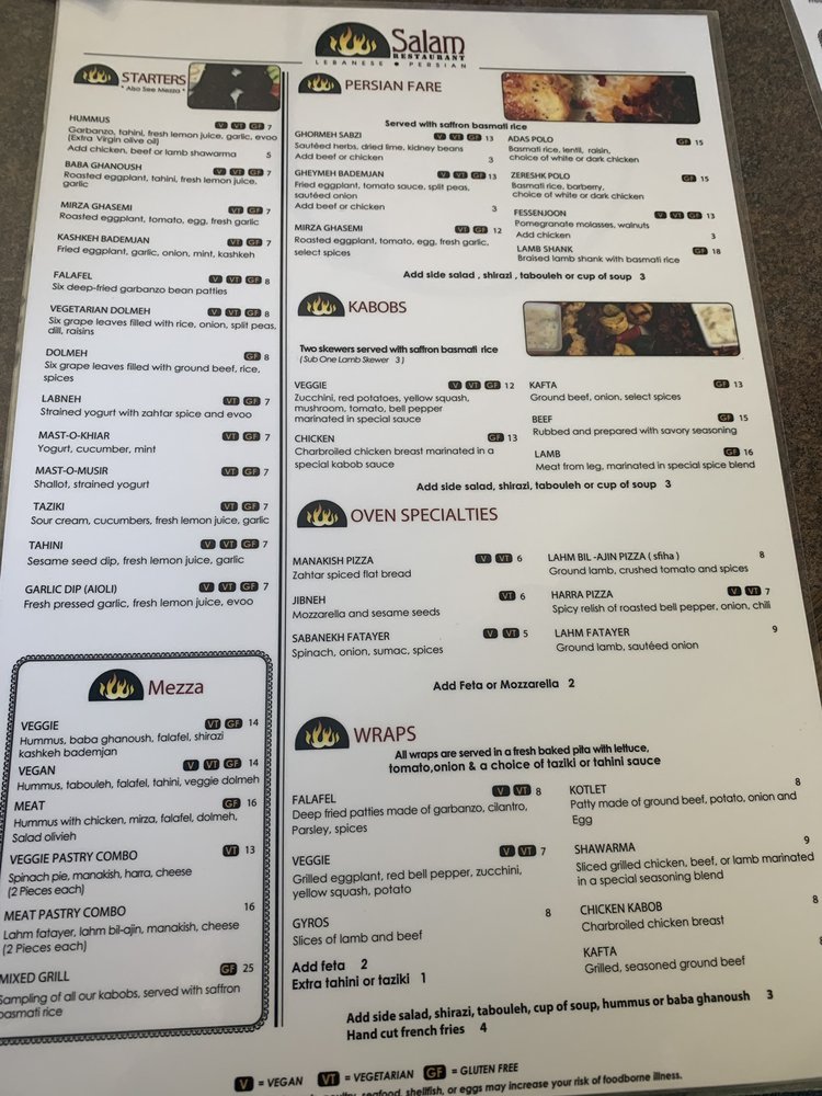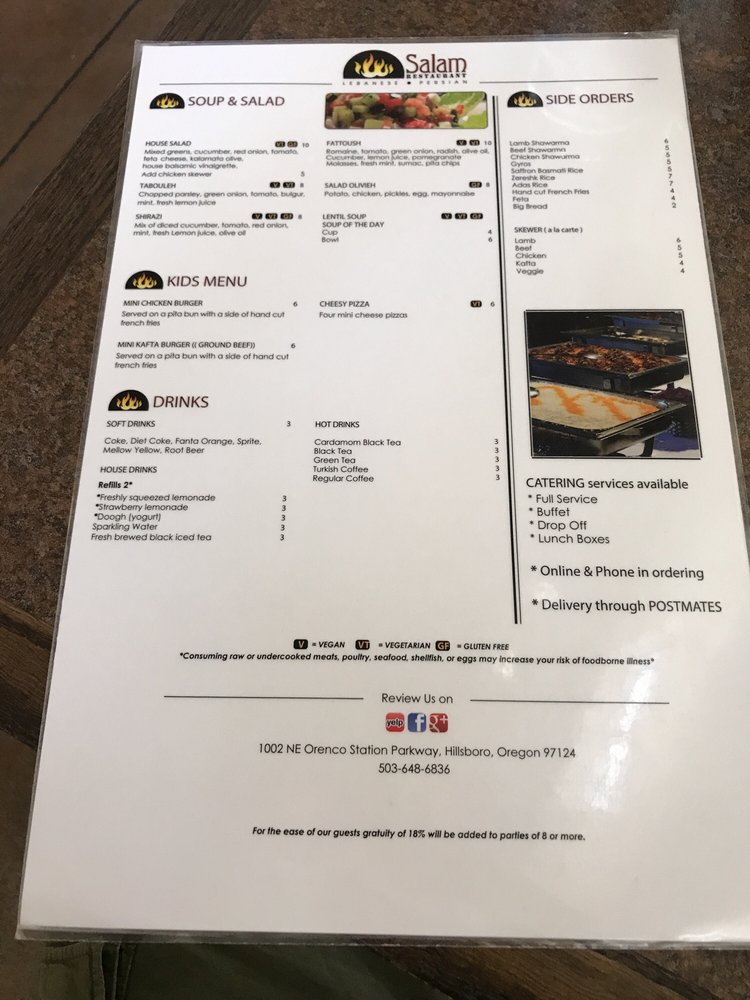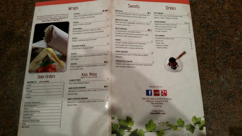 Introducing the menu at Salam Restaurant, a Persian/Iranian-Lebanese-Mediterranean spot in Hillsboro, OR. The restaurant offers a wide range of options such as vegan and vegetarian dishes, cocktail specials, beer selections, and draft beers. Customers rave about the freshly baked bread, hummus, eggplant appetizer, falafels, house salad, and sampler dessert plate. The service is praised as attentive and the atmosphere is described as warm and welcoming. Highlights include the Mezza Family Chicken Plate and Shawarma Lamb Plate, both delicious and generously portioned. The complimentary warm pita bread adds a unique touch to the dining experience. Overall, Salam Restaurant is recommended for those looking for healthy and flavorful Middle Eastern cuisine in a cozy setting. Patrons appreciate the friendly staff, ample portions, and the option for outdoor seating. Experience the warmth and genuine hospitality at Salam Restaurant today.