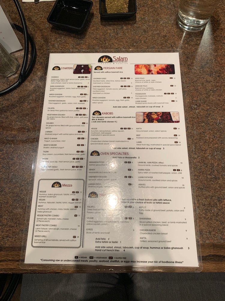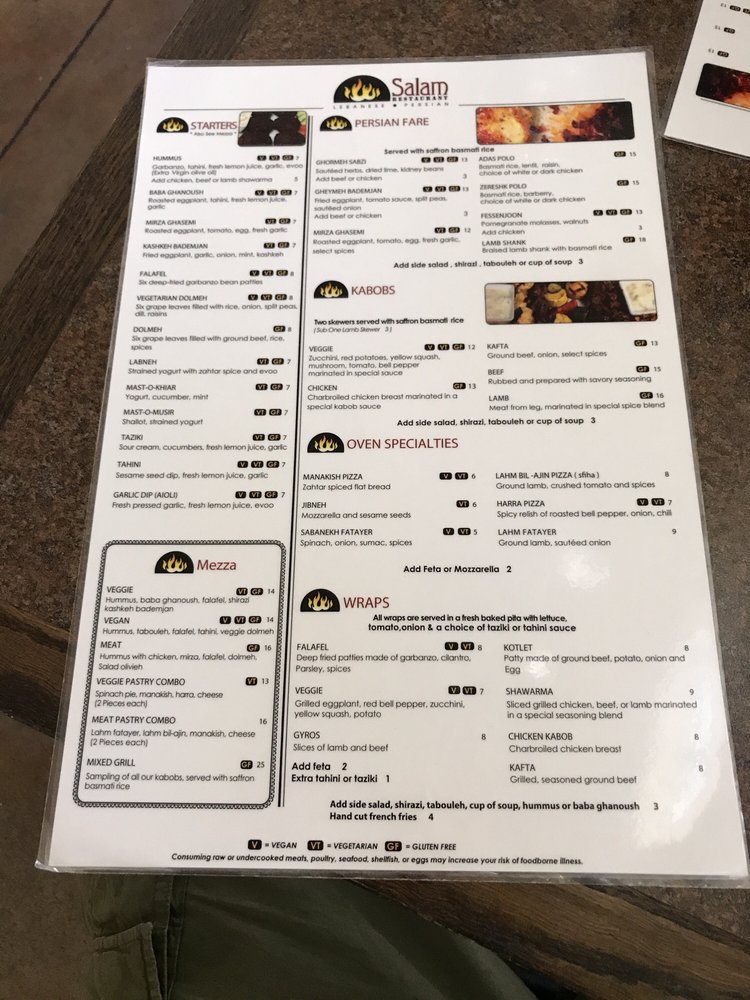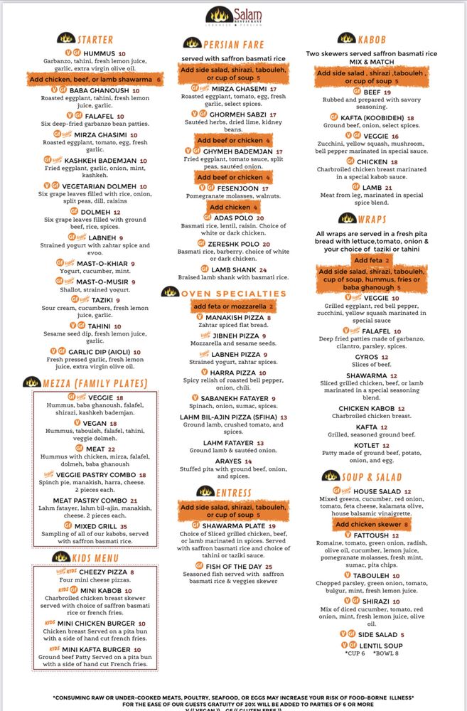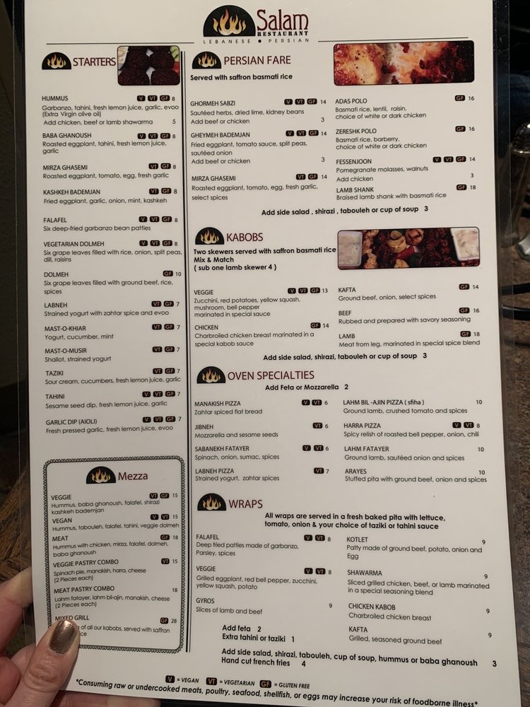 Introducing the menu at Salam Restaurant, a Persian/Iranian-Lebanese-Mediterranean spot in Hillsboro, OR. The restaurant offers a wide range of options such as vegan and vegetarian dishes, cocktail specials, beer selections, and draft beers. Customers rave about the freshly baked bread, hummus, eggplant appetizer, falafels, house salad, and sampler dessert plate. The service is praised as attentive and the atmosphere is described as warm and welcoming. Highlights include the Mezza Family Chicken Plate and Shawarma Lamb Plate, both delicious and generously portioned. The complimentary warm pita bread adds a unique touch to the dining experience. Overall, Salam Restaurant is recommended for those looking for healthy and flavorful Middle Eastern cuisine in a cozy setting. Patrons appreciate the friendly staff, ample portions, and the option for outdoor seating. Experience the warmth and genuine hospitality at Salam Restaurant today.